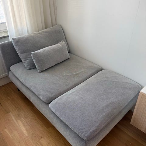 Säljer nu vår bekväma fåtölj på grund av platsbrist. Fåtöljen har en stilren, skandinavisk design med en stomme i vackert mörkbetsat formpressat trä och en ljus, tålig klädsel.