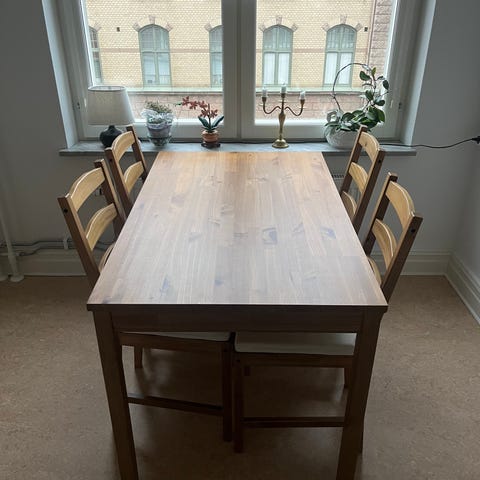 Fyrkantigt matbord med 2 stolar. Kuddar till stolar ingår.