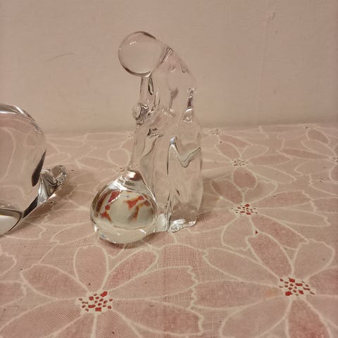 Olle brozén glasfigurer i form av bilar, tre stycken i olika färger: blå, klar och röd. Dessa glasfigurer är dekorativa och kan användas som samlarobjekt eller prydnad. 500 styck eller 1000 för alla tre