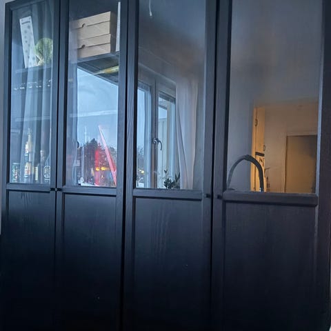 Svart vitrinskåp från IKEA, modell Billy/Oxberg. Mått enligt bild fem. Hyllplan ingår. Varsamt använd.
