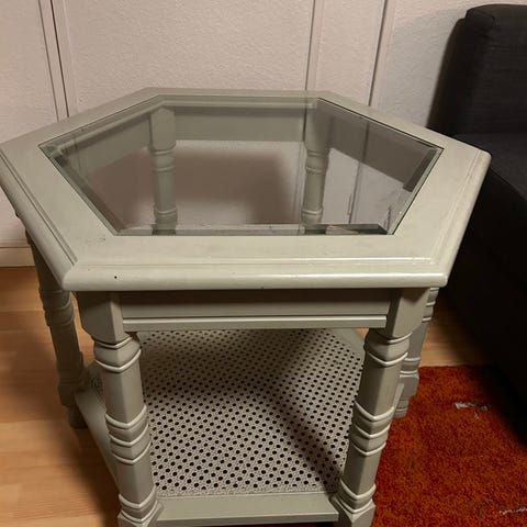 Ett sexkantigt litet bord som jag målat i en matt, mörkgrön kvalitetsfärg.