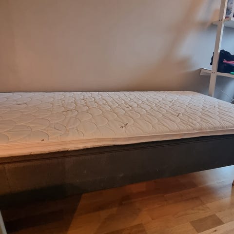 Säljer en 90 cm bred säng med ben och bäddmadrass.