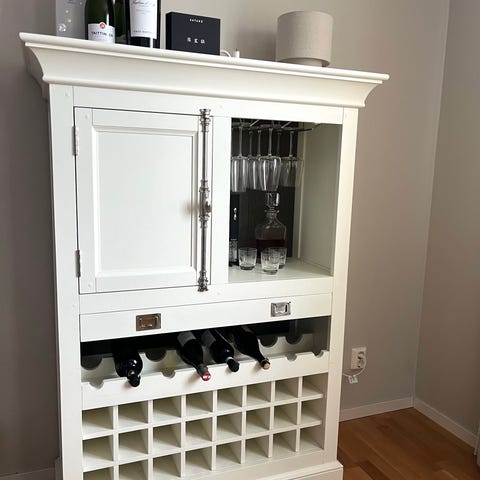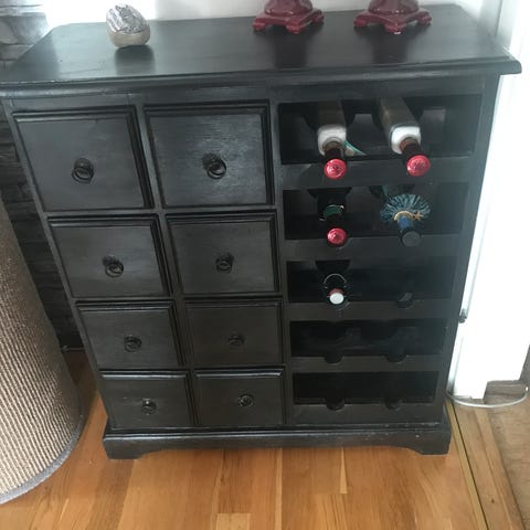 Dekorativ och funktionell möbel i svart trä med inbyggd vinhylla för ca 12 flaskor samt tre rymliga lådor med metallhandtag.