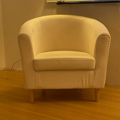 Trevlig och bekväm klubbfåtölj från IKEA i gott skick. Tyget har fått några fläckar under årens lopp (se bilder) men det går lätt att köpa ny klädsel på IKEA (t ex https://www.ikea.com/se/sv/p/tullsta-fatoeljklaedsel-nordvalla-mellangra-20320897/#content) och få en stol som känns som ny. Samma mått som fåtöljen Tullsta men en äldre modell. Finns att hämta i Ströbylund.