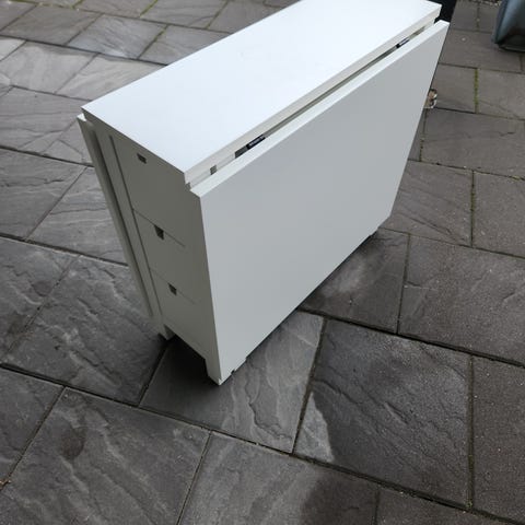 Fint vitt slagbord från IKEA. För mått se bild. Praktiskt och flexibelt bord med inbyggd förvaring. Välanvänt men i fint skick. Två lådor som ej helt gått att få bort märken inuti samt en liten repa på bordsytan (se bilder). I övrigt mycket fint skick! Nypris 2995 kr.