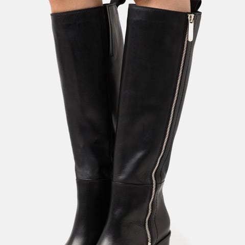 Ett par knähöga stövlar i läder med spetsig tå och klädd blockklack. Foder i läder. Klackhöjd 8,5 cm. Aldrig använda och slut online. Storlek 42