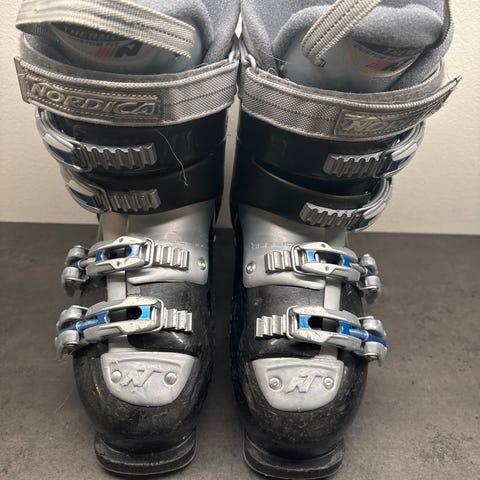 Salomon skidpjäxor i röd färg, storlek 23,5 och har fyra spännen för justering.