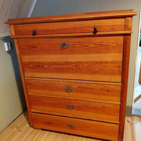 En väldigt fin och svensktillverkad chiffonjé. Vet inte från vilket årtiode den är ifrån men den är minst 50år gammal och i en robust kvalitet. Det enda jag kan anmärka på, förutom att åren satt lite spår, är att det vita som sitter runt nyckelhålet längst ner är trasigt. Det är inget som stör funktionen. Det finns två nycklar. Det är stabil och tung så ta med bärhjälp. Hämtas i Malma Backe.