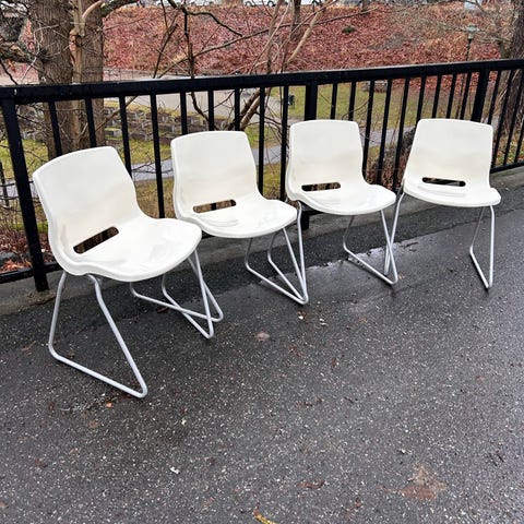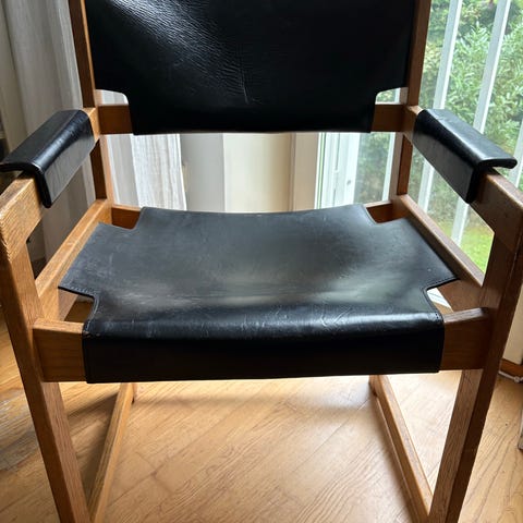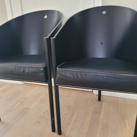 Stomme i svartlackerade stålrör, sits i brunt läder, stapelbara. Sitthöjd 46cm.