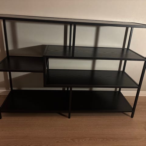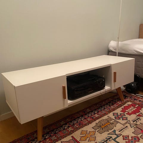 Stilren och modern tv-bänk med en lättskött yta i lackerad metall. Kan även användas som vanlig hylla för inredning. Köpt för några månader sedan så knappt använd.