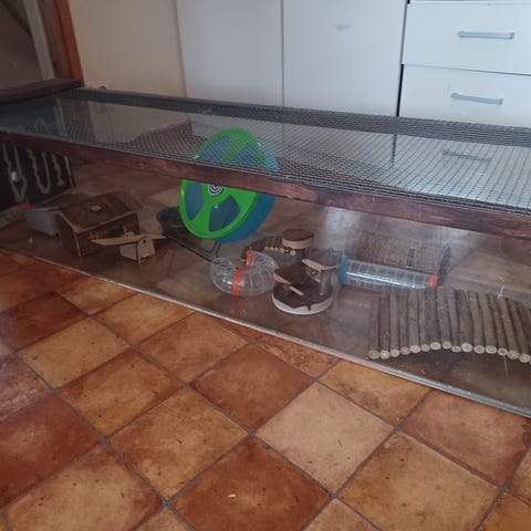 hamsterbur med några tillbehör som bland annat ett 33cm hjul. Allting i gott skick mått på buren är 1,63M lång 35cm hög