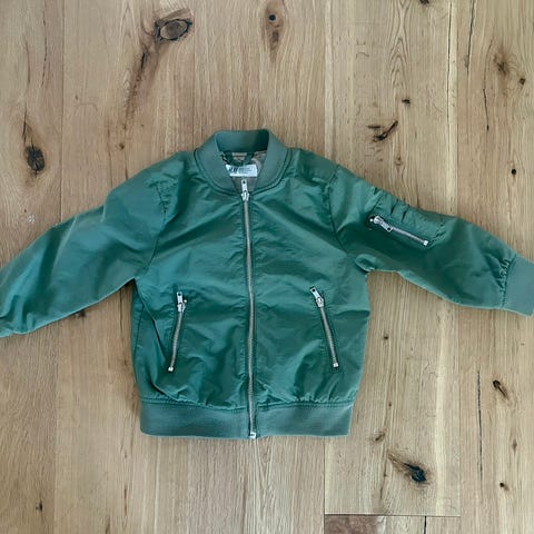 Bomberjacka med knäppning framtill och ribbade muddar vid ärmslut och nederkant. Från djur- och rökfritt hem.