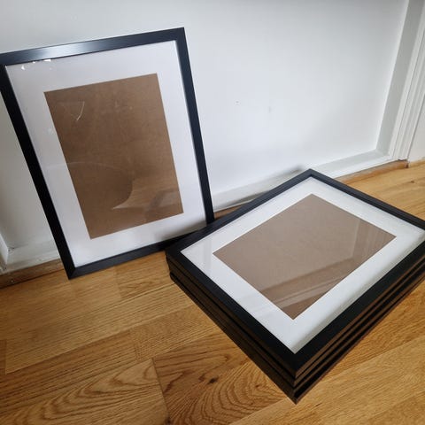 Säljer ett paket med IKEA-ramar i olika storlekar (Ribba och Söndrum). Alla är begagnade och inte i nyskick. Vissa ramar har bubblor och damm.