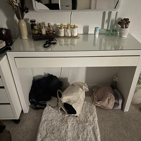 Säljer mitt älskade sminkbord pga flytt som inte kommer få plats. Den har sina sprickor längst nere i kanten pga en flyttfirma när jag flyttade sist. Men annan jätte fint skick.