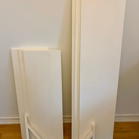 Två stycken Pythagoras Play hyllor från Maze, formgivna av Gustav Rosén. Hyllplanen är i obehandlad furu (MDF och ekfanér) som går att både betsa eller måla för att sätta egen prägel. De triangelformade konsolerna är tillverkade av metall. Konsolerna kan placeras på olika sätt. Hyllplanen har några enstaka märken (se sista bilderna) som kan slipas bort.