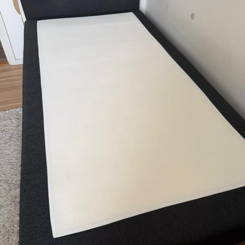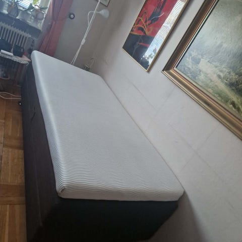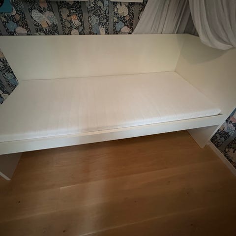 Säng med svart tyg, kommer med tillhörande madrass och ben. Längd 105 cm. Några skavanker finns pågrund av våran katt tyvärr, men din sömn blir 10/10!!