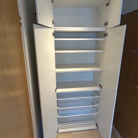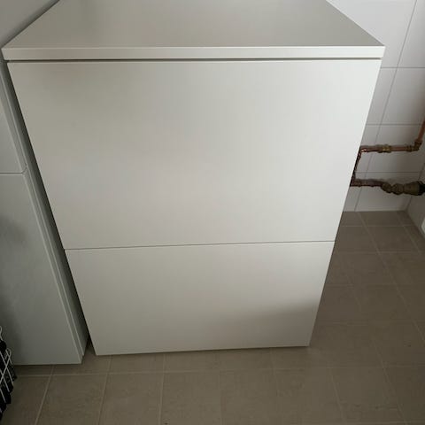 Tre vägghängda IKEA-skåp av modell Platsa.