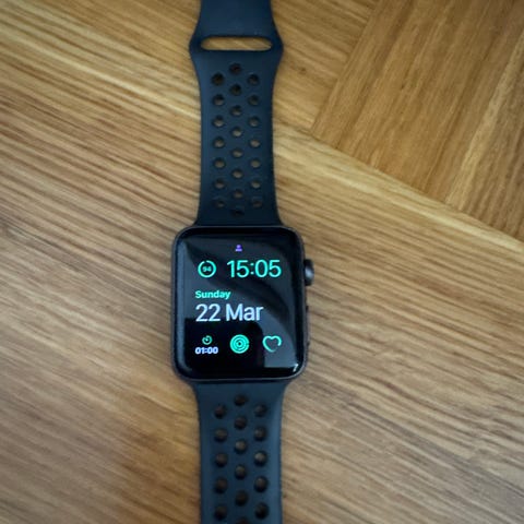 Säljer en Apple Watch Series 3, 42 mm, svart. Originalkartong och papper och laddkabel ingår. Ett nytt oanvänt S/M-armband samt ett använt M/L-armband medföljer. Batteriet håller ca 2 dagar vid normal användning. Säljes p.g.a. uppgradering till ny Apple Watch.