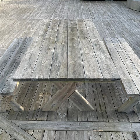 Trädgårdsbord i grått med fyrkantiga ben. Bordet är utformat för utomhusbruk och passar som möbel på altan eller i trädgård.