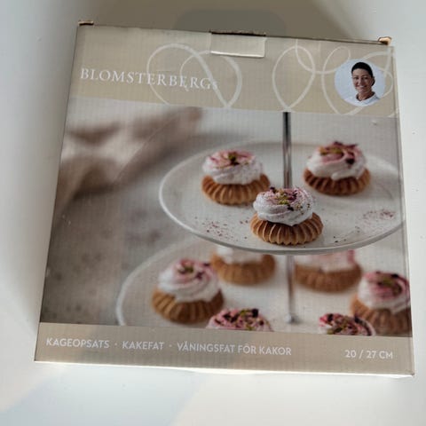 Hackman kakfat i glas med två våningar. Fatet består av två runda glasplattor med mönster, monterade på en metallstång med handtag för enkel hantering. Lämpligt för servering av kakor och bakverk.