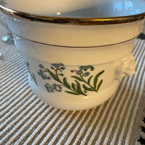 Dekorativ äldre kruka i porslin med klassiskt blommönster i milda färger. Krukan har guldfärgade detaljer med ringhandtag samt fot, vilket ger ett elegant och tidstypiskt uttryck.