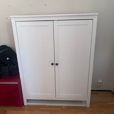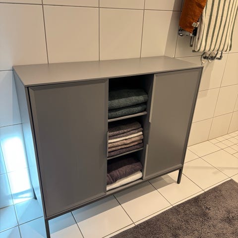 Skåp i vit metall från IKEA som passar i såväl vardagsrummet, kontoret eller som i mitt fall badrummet. Skåpet har höga ben som underlättar städning och låsbara dörrar. Slitage på ovansidan visas på bild 5 och 6.