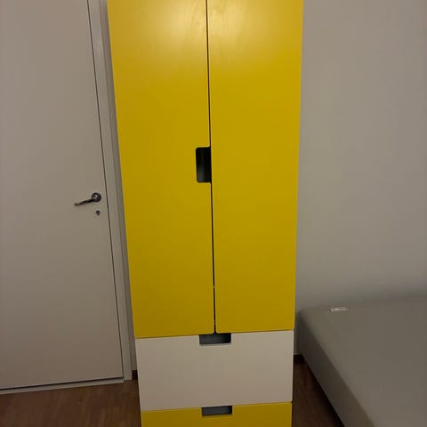 "Platsa" stomme med ett ”hjälpa” hyllplan från IKEA. Haft stående ovanpå mina köksskåp med dekorativ förvaring så möbeln är i mycket gott skick. Enstaka märke på insidan visas på bild 3 och 4.