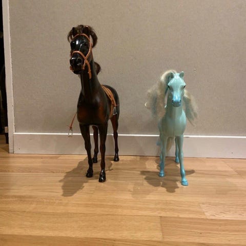 Två av hästarna är utförda i ljust trä med handgjorda läderdetaljer och metallringar, vilket ger ett autentiskt och tidstypiskt uttryck. Den tredje hästen är äldre, mörkare och bemålad, med vacker patina och tydligt åldersslitage som förstärker dess karaktär och samlarvärde.