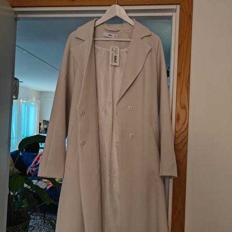 Dubbelknäppt modell med bälte i midjan som ger fin passform.