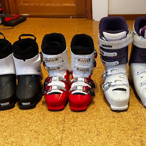 Slalompjäxor 4 par i storlekar mellan 35-39 samt slalomhjälm för barn.