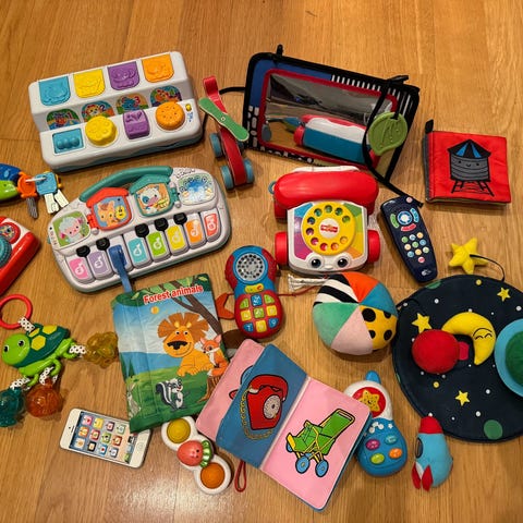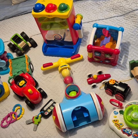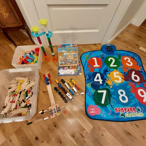 Samling av barnleksaker i trä och plast i olika modeller och färger. Innehåller bland annat byggklossar, instrument, bollar och figurer. Lämpligt för barn i olika åldrar för lek och motorisk träning. Kommer från rök- och husdjursfritt hem.