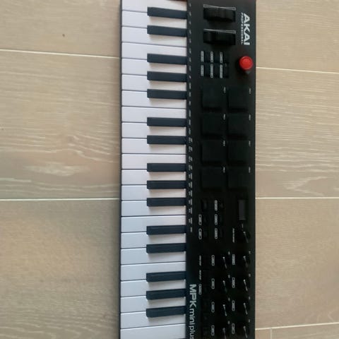 Nektar MIDI Keyboard med 49 tangenter, svart och röd färg. Utrustad med reglage för volym och transportfunktioner samt anslutningar för USB, hörlurar och utgång.