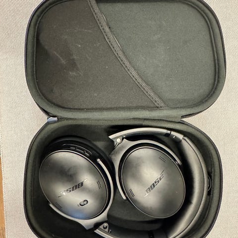 Sony WH-1000XM3 trådlösa hörlurar i svart färg. Hörlurarna levereras med ett hårt skyddsfodral, laddningskabel och flygplansadapter. Modellen är känd för sin brusreducering och komfort vid användning under längre perioder.