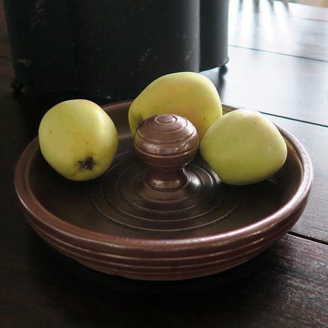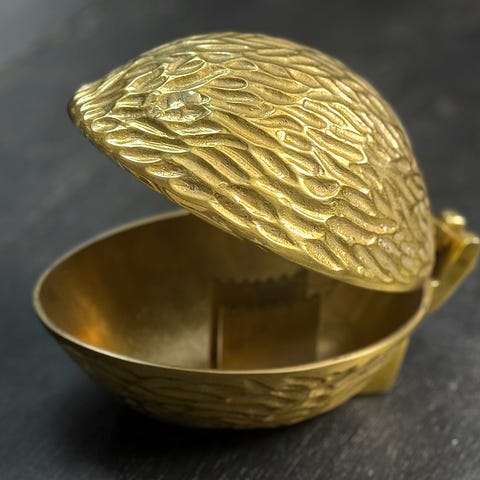 Silen har en intressant konstruktion där den dekorativa ramen och handtaget är i ljust nysilver/metall, medan själva silskålen är utförd i mässing, vilket ger en snygg materialkontrast. Notera att ställningen är en öppen ringmodell (saknar botten) och fungerar som ett dekorativt stativ för silen.