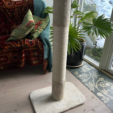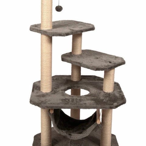 Grå kattklätterställning med flera nivåer, två hängande korgar och en liten koja. Utrustad med rep för klösning och orange hängande leksaker. Materialet är mjukt och täckt med tyg för kattens komfort. Ca 170 cm hög.