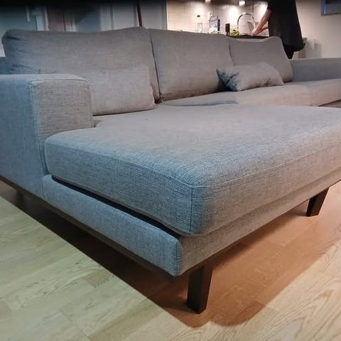 Mörkgrå tresitsig soffa med divan del. Köpt på Jysk. Går att skruva isär.