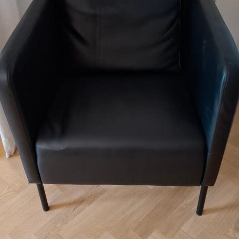 Ikea Sundmo fåtölj. Grått tyg och svarta ben i trä. Synligt använd med lite färgfläck på ett av benen. I övrigt helt okej skick.