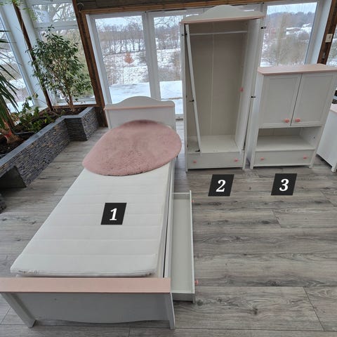 Säng, Nattduksbord, Byrå, Skrivbord o Stol