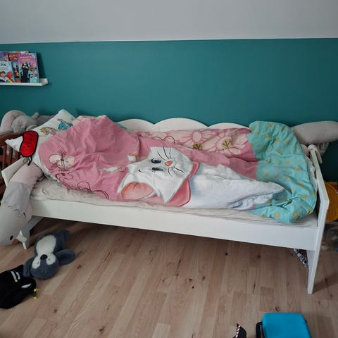 Säng, Nattduksbord, skrivbord, skrivbordsstol, lampa, byrå. Allt tillsammans