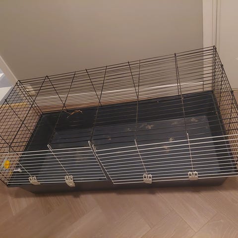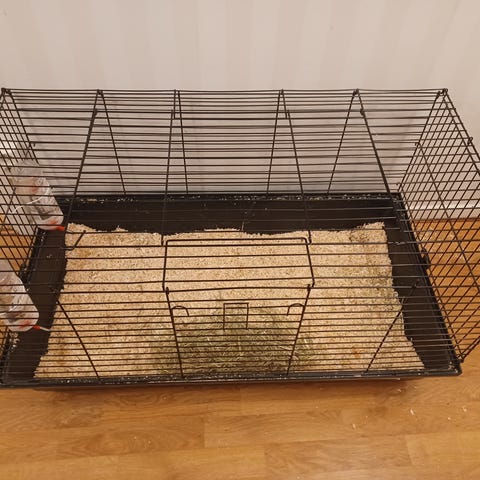 Bur för smådjur med svart metallgaller och plastbotten. Buren har en öppningsbar lucka på ovansidan och en mindre dörr på framsidan. Botten är täckt med spån för djurets komfort.