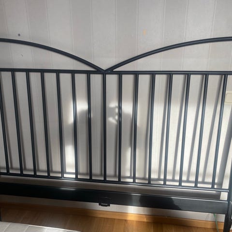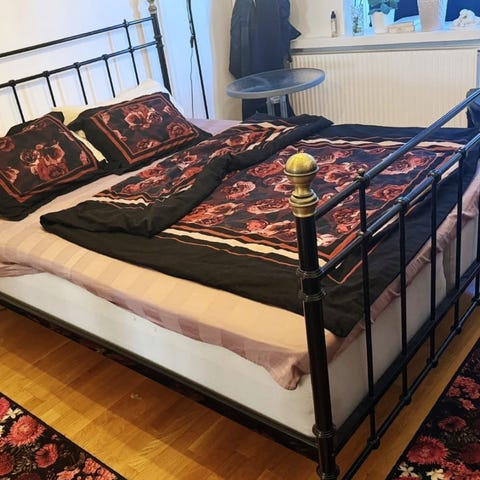 Svart metallram säng med detaljer i guld 2mx1,6m. Två stycken madrasser från jysk 2mx0.8mx0.13m köptes förra året och användes fåtal gånger då vi hade det till familj och vänner från Nederländerna som stannade några nätter under året. Madrasserna är fortfarande fräscha och inga fläckar.