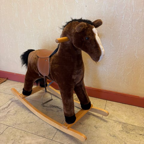 Gunghäst som gör ljud när man trycker på öronen. Finns på Kungsholmen.