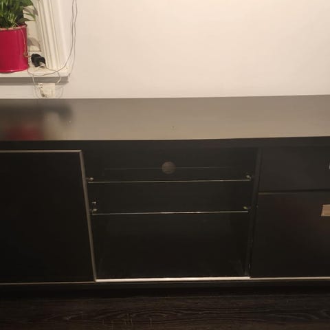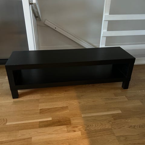 IKEA Malm TV-bänk i vitt med två skåp och en öppen hylla i mitten. Möbeln är utformad för att rymma en TV och tillhörande utrustning. Enkel design med släta ytor och funktionella förvaringslösningar.