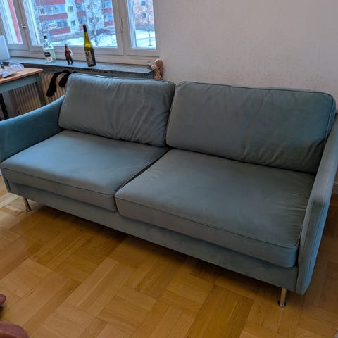 Fin allmogesoffa, 105cm som högst i ryggen. Förmodligen tillverkad i Västerbotten med omnejd. 1850–1900 tal