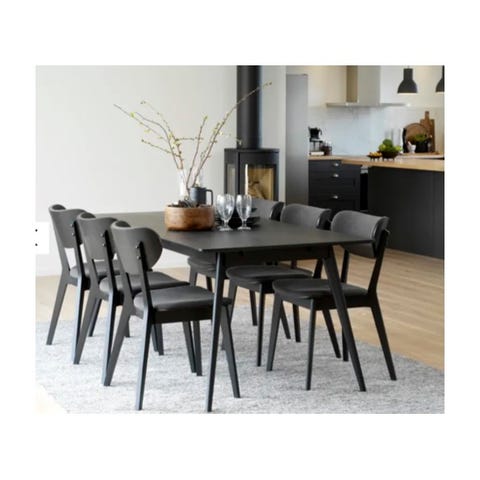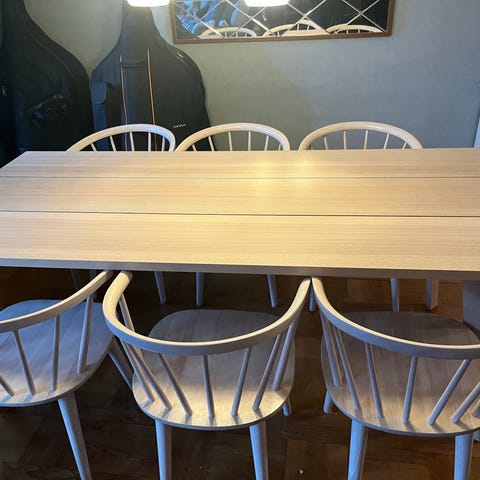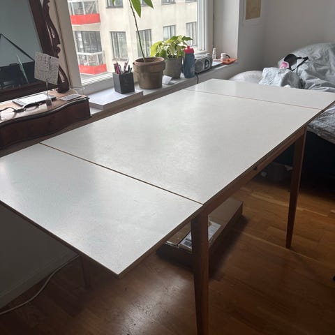 56 cm bred iläggsskiva som kan förvaras i bordet (se bild). Då blir bordet 220cm långt.