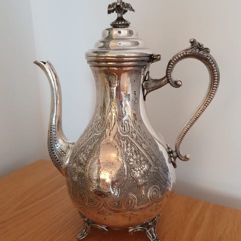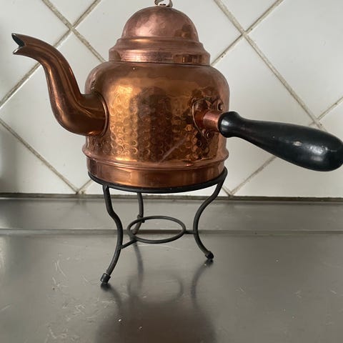 Antik gammal i koppar kanna på med tillhörande stativ. Kannan har en rund kropp med pip och lock, samt ett handtag. Stativen har tre ben för stabilitet. Produkten är avsedd för att koka och servera te.flrt i tiden