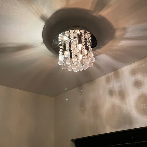 Taklampa med en svart skärm och flera hängande glasdroppar. Lampan är designad för takmontering och ger ett dekorativt ljus med sina glasdetaljer. Extra ”glasdroppar” medföljes samt lamppropp. Köpes och hämtas