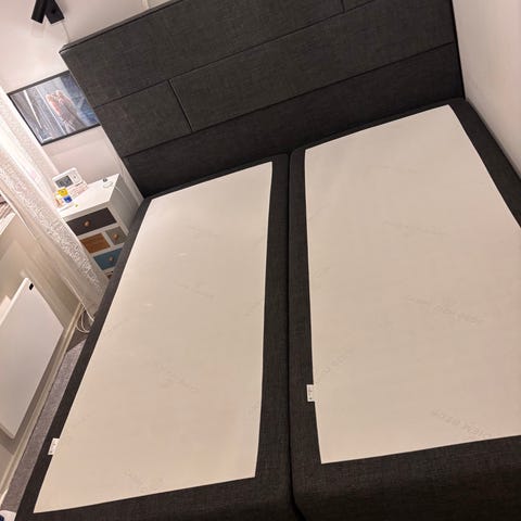 Två sängar är som oanvända 80x200 cm höjd 40 cm. med gavel bredd 170 höjd 134cm. Färg grå.sängarna som nya. Mellanmadrass borttagen sängarna kan användas lika bra med vanliga madrasser.