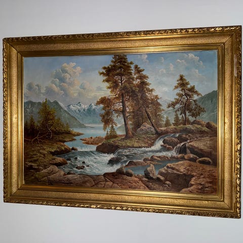 Signerat måleri föreställande landskap med sjö och berg i bakgrunden. Målningen är utförd på duk och är inramad i en träram. Signaturen är tydligt synlig på framsidan av målningen.