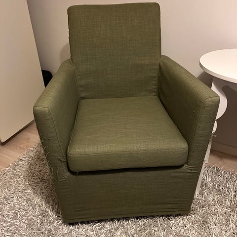 Fåtöljer köpta på Mio. Beigegrått tyg.